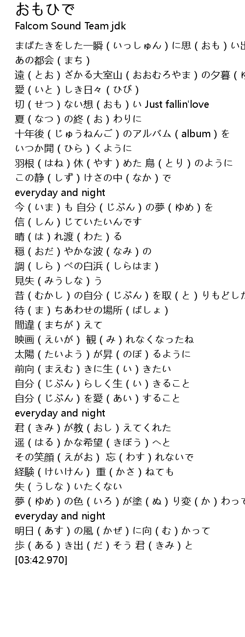 | [03:41.970] | 歩(ある)き出(だ)そう 君(きみ)と |