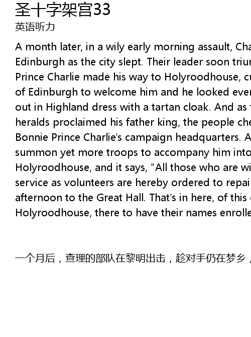 | 一个月后,查理的部队在黎明出击,趁对手仍在梦乡,攻占了爱丁堡。他们的统领也意气风发地随后而至,查理王子前往荷里路德宫之际,好奇的群众在路旁欢迎。他一身高地服装,配上格子呢斗篷,确实有王子风范。当喇叭吹起,传令官宣称他父亲是国王时,群众都欢呼起来,宫殿成为了王子的起义总部。这是他召集人民参战的军令,就在荷里路德宫这里写成,上面写着:志愿者须于今午二时,在大礼堂报到…即是这里就在荷里路德宫这里点名,签名的就是查理。 |