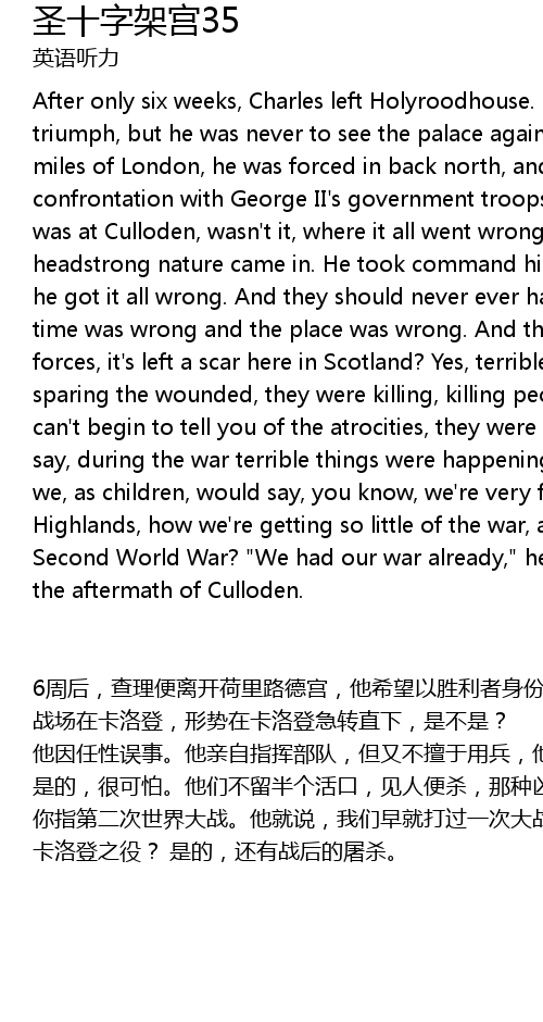 | 6周后,查理便离开荷里路德宫,他希望以胜利者身份回来,可惜他永远再见不到这座宫殿。他行军进入伦敦130英里之内,但很快被迫退向北面,终于在因弗内斯附近,和乔治二世的政府军作最后决战。 战场在卡洛登,形势在卡洛登急转直下,是不是? 他因任性误事。他亲自指挥部队,但又不擅于用兵,他用错策略,时机地点都不对,根本不应该在这里作战,政府部队后来的行为也留下烙印? 是的,很可怕。他们不留半个活口,见人便杀,那种凶残暴戾,完全难以言喻。大战时,家父常说战争是可怕的事,我们就说,其实我们十分幸运,战事难得触及高地这里。 你指第二次世界大战。他就说,我们早就打过一次大战。 卡洛登之役? 是的,还有战后的屠杀。 |