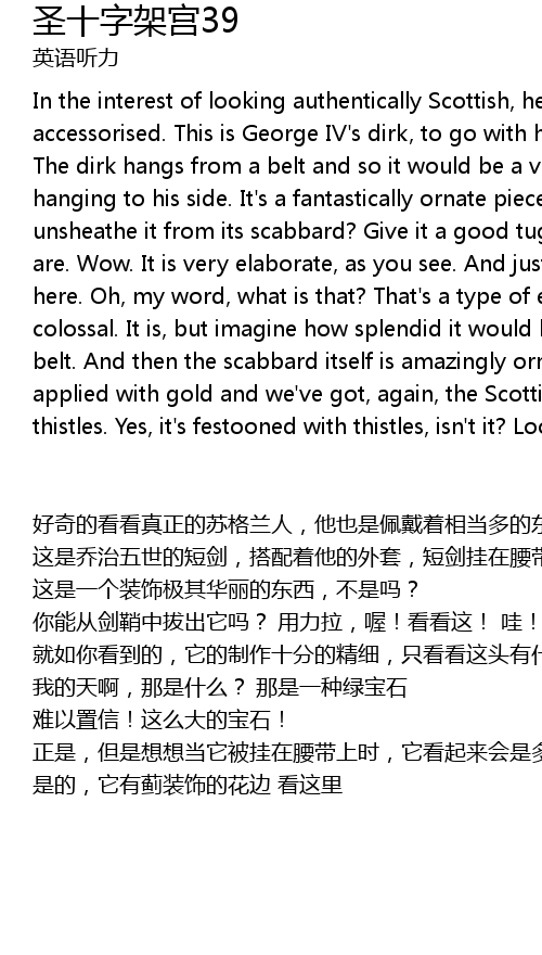 | 好奇的看看真正的苏格兰人,他也是佩戴着相当多的东西。 这是乔治五世的短剑,搭配着他的外套,短剑挂在腰带上,所以这将会是一个挂在外面的非常显眼的东西。 这是一个装饰极其华丽的东西,不是吗? 你能从剑鞘中拔出它吗? 用力拉,喔!看看这! 哇! 就如你看到的,它的制作十分的精细,只看看这头有什么? 我的天啊,那是什么? 那是一种绿宝石 难以置信!这么大的宝石! 正是,但是想想当它被挂在腰带上时,它看起来会是多么的华丽。剑鞘的本身也是让人惊讶的,如此华丽的装饰。剑鞘镀着金,我们再次看到了苏格兰的纹章,更多的蓟。 是的,它有蓟装饰的花边 看这里 |