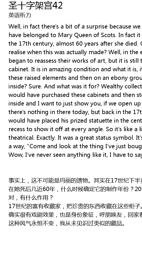 | shi shi shang, zhe bu ke neng shi ma li de yi wu. qi shi zai 17 shi ji xia ban ye zhi cheng, zai ta si hou ji jin 60 nian, shen me shi hou que ding ta de zhi zuo nian fen? 20 shi ji chu, ren men kai shi chong xin jian ding cang pin. bu guo, ta shi zhong shi ge hen mei li de gui zi, you bao cun de zhe me hao. zhe shi dai mao, he hei tan mu bei jing hu xiang hui ying, bu ru kan kan li mian? dui, you shen me zuo yong? 17 shi ji de fu you shou cang jia, ba zhen gui de dong xi shou cang zai zhei xie gui zi. wo ba men da kai, rang ni kan kan li mian, jin tian mei you shou cang pin zai nei, dan 17 shi ji de shou cang jia, hui ba zhen cang de su xiang fang zai zhong yang. ao wei you jing zi, ke zhao chu mei ge jiao du, hao xiang yi ge xiao ju chang? que shi hen you xi ju xiao guo, ye shi shen fen xiang zheng, hu peng huan you, hui jia kan xin de shou cang pin? zhe zhong feng qi yong heng bu bian, wo cong wei jian shi guo lei si de cang pin. |