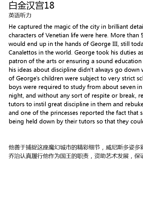 | 他善于捕捉这座魔幻城市的精彩细节,威尼斯多姿多彩的生活都汇于这一幅幅天地。50多幅卡纳莱托的作品,最终都到了乔治三世的手里。今天这里仍然是世界上收藏他的画作最多的地方。 乔治认真履行他作为国王的职责,资助艺术发展,保证皇室后代的教育,但是他规范纪律的想法,并没有很好地传承给他15个孩子。乔治所有的孩子,都被禁锢于严厉的教学和教育之中。男孩子要从早上7点学习到晚上8点,完全没有一刻休息,乔治命令家庭教师给孩子们灌输严格纪律的意识,被瞅见有一丝懈怠就会遭责骂。有个公主说她看到她的两个哥哥在被教师责罚,像狗一样被鞭打。 |