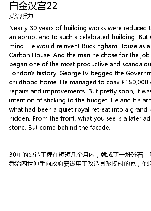 | 30 nián de jiàn zào gōng chéng zài duǎn duǎn jǐ gè yuè nèi, jiù chéng le yī duī suì shí, xiǎn hè de gōng diàn huà wéi wū yǒu. dàn qiáo zhì yǒu gèng dà de xióng xīn zhuàng zhì, tā yào chè dǐ gǎi zào bái jīn hàn gōng, shǐ zhī yuǎn shèng yú kǎ ěr dùn gōng. tā xuǎn zé le jiàn zhù shī yuē hàn nà shí lái fù zé zhè xiàng gōng zuò, yí gè lún dūn lì shǐ shàng jí fù xiào lǜ dàn chòu míng yuǎn yáng de jiàn zhù hé zuò gōng chéng jiù zhè yàng kāi shǐ le. qiáo zhì sì shì shēn shǒu xiàng zhèng fǔ yào qián yòng yú gǎi zào qí hái tí shí de jiā, tā yǐ wéi xiū hé gǎi shàn de míng yì piàn qǔ le 15 wàn yīng bàng. dàn bù jiǔ, qiáo zhì bù shàn yù suàn, qián jiù huā guāng dài jìn. tā hé tā de jiàn zhù shī yuē hàn nà shí, zhǐ hǎo zhuǎn xiàng huáng gōng nèi bù de gǎi zào. jīn tiān, zhè zuò gōng diàn bèi yǐn cáng zhe. wài guān shàng, nǐ kàn dào de shì hòu lái yòng bái sè shí huī shí xiū zhěng guò de |