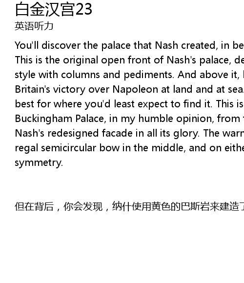 | You' ll discover the palace that Nash created, in beautiful yellow Bath stone. This is the original open front of Nash' s palace, designed in the classical style with columns and pediments. And above it, heroic friezes depicting Britain' s victory over Napoleon at land and at sea. But perhaps he saved the best for where you' d least expect to find it. This is the loveliest view of Buckingham Palace, in my humble opinion, from the garden. And here you can see Nash' s redesigned facade in all its glory. The warm yellow stone, the perfect regal semicircular bow in the middle, and on either side, tasteful classical symmetry. | |
