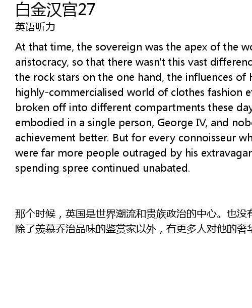 | 那个时候,英国是世界潮流和贵族政治的中心。也没有像今天那样有很多的不同,有摇滚巨星,有好莱坞巨大的影响,还有高度商业化的服饰等等。今天所有的一切,都分化成不同的个体。但在那个时代,除了乔治四世,别无他人,能有如此成就。 除了羡慕乔治品味的鉴赏家以外,有更多人对他的奢华感到愤慨但他毫不理会,仍然无节制的花钱。 |