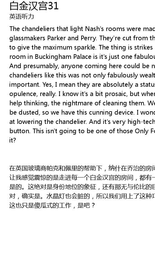 | 在英国玻璃商帕克和佩里的帮助下,纳什在乔治的房间里都装上了水晶灯。他们切割出了最好的铅玻璃水晶以便能发出最耀眼的光芒。 让我感觉震惊的是走进每一个白金汉宫的房间,都有一个巨大的水晶灯,大概来到这里的每个人都不会怀疑,这里的水晶灯不仅仅是显示富有,还是显示它的重要性。 是的。这绝对是身份地位的象征,还有那无与伦比的巨富,可能我的问题有点无趣,但我看着这些水晶灯不禁会想,要清洁这些水晶灯,真是个恶梦。 对,确实是。水晶灯也会脏的,所以我们用上了这种巧妙的工具。你有没有兴趣试下,把水晶灯放下来,非常高科技的,只需要按一下按钮就可以了。 这也只是傻瓜式的工作,是吧? |