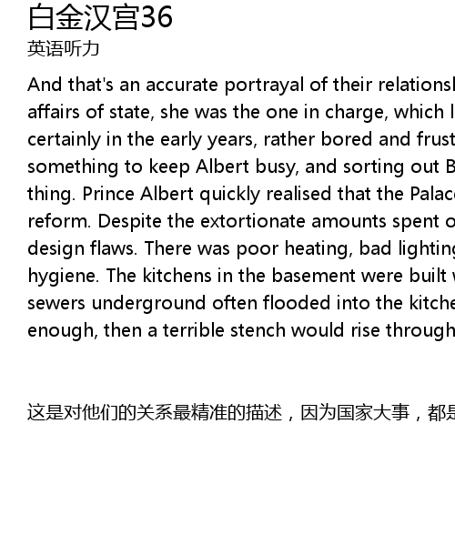 | 这是对他们的关系最精准的描述,因为国家大事,都是由女王决定,把阿尔伯特撂在一边,刚开始呢,他也感到无趣和沮丧,当然阿尔伯特也需要找点事情来做,整理白金汉宫是最好的选择。阿尔伯特很快意识到白金汉宫需要紧急维修,尽管已经花了大本钱来修整宫殿。但是设计上的缺陷仍让人感到震惊,糟糕的供暖系统,照明系统,还有让人绝望的卫生。地下室的厨房竟然没有窗户,下水道的水经常涌进厨房,似乎这还不算最糟的。最糟的是,导致整个宫殿里弥漫着恶臭。 |