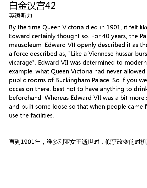 | zhi dao 1901 nian, wei duo li ya nv wang shi shi shi, si hu gai bian de shi ji dao le. zhi shao ta de er zi, ai de hua, shi na yang xiang de. 40 nian jian, bai jin han gong shi zhi shang jiu shi yi zuo ling mu, ai de hua qi shi ye shi zhe yang gong kai de xing rong ta, xian zai ta zhi gao qi ang di jin ru gong dian, jiu xiang wei ye na qi shi tu ran chuang ru ying guo jiao qu mu shi wu yi yang. ai de hua qi shi jue xin dui bai jin han gong jin xing xian dai hua gai zao, ju ge li zi, wei duo li ya nv wang cong bu yun xu zai bai jin han gong fu jin de gong gong kong jian an zhi ce suo. suo yi ru guo ni huo yao can jia zhao dai hui, huo zhe you shi qu na bian, zai ci 24 xiao shi zhi qian bu yao he ren he dong xi, er ai de hua qi shi hai shi ting you tong qing xin de. ta jian zao le yi xie ce suo, rang lai zhe li de ren men ke yi yong shang zhei xie she shi. |