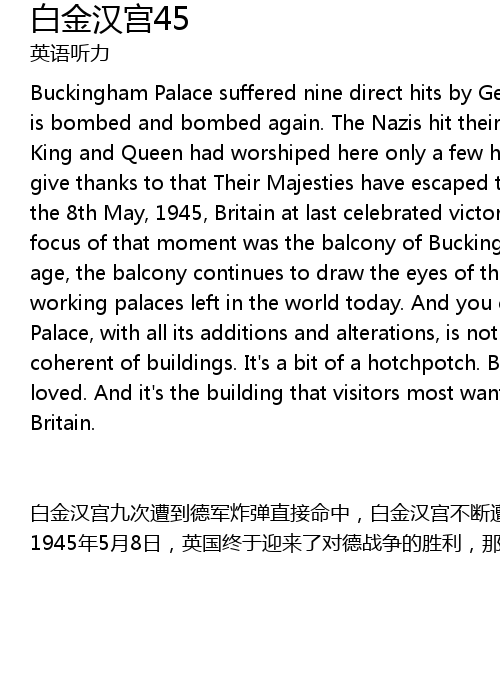 | bái jīn hàn gōng jiǔ cì zāo dào dé jūn zhà dàn zhí jiē mìng zhòng, bái jīn hàn gōng bù duàn zāo dào hōng zhà nà cuì dé guó hái xí jī bì xià de sī rén xiǎo jiào táng, guó wáng hé wáng hòu zài jǐ gè xiǎo shí yǐ qián hái zài zhè lǐ zuò dǎo gào, suǒ yǒu wén míng de rén men dōu hěn qìng xìng bì xià táo guò le nà cuì de yě mán gōng jī. 1945 nián 5 yuè 8 rì, yīng guó zhōng yú yíng lái le duì dé zhàn zhēng de shèng lì, nà yī kè, jù jiāo zài bái jīn hàn gōng de zhè gè yáng tái zhī shàng. zài jīn tiān, zhè gè yáng tái réng rán xī yǐn zhù le shì jiè de mù guāng. dāng jīn shì jiè shang, jī hū méi yǒu kě gōng shēng huó qǐ jū hé gōng zuò de gōng diàn le. nǐ yě kě yǐ rèn wéi bù duàn tiān jiā hé gǎi dòng de bái jīn hàn gōng, bú shì zuò yī mài xiāng chéng de jiàn zhù. tā jiù shì yí gè dà zá huì, dàn tā réng rán wèi dà duō shù rén suǒ xǐ ài. duì hěn duō dào yīng guó de yóu rén lái shuō, bái jīn hàn gōng shì bì dào zhī chù. |
