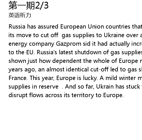| Russia has assured European Union countries that they have nothing to fear from its move to cut off gas supplies to Ukraine over a payment dispute. The state energy company Gazprom sid it had actually increased the volume of gas flowing to the EU. Russia's latest shutdown of gas supplies to Ukraine has once again shown just how dependent the whole of Europe now is on Russian energy. Three years ago, an almost identical cut-off led to gas shortages as far away as France. This year, Europe is lucky. A mild winter means there are more gas supplies in reserve . And so far, Ukrain has stuck to its promise, not to disrupt flows across its territory to Europe. |