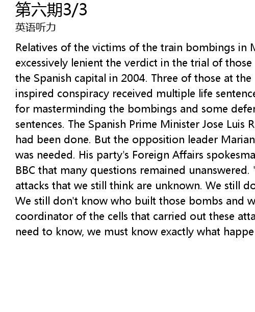 | Relatives of the victims of the train bombings in Madrid have condemned as excessively lenient the verdict in the trial of those involved in the attacks in the Spanish capital in 2004. Three of those at the heart of the al-Qaeda inspired conspiracy received multiple life sentences. But nobody was convicted for masterminding the bombings and some defendants received relatively light sentences. The Spanish Prime Minister Jose Luis Rodriguez Zapatero said justice had been done. But the opposition leader Mariano Rajoy said more investigation was needed. His party's Foreign Affairs spokesman Gustavo de Aristegui told the BBC that many questions remained unanswered. "Certain details of these atrocious attacks that we still think are unknown. We still don't know who gave the order. We still don't know who built those bombs and we still don't know who was the coordinator of the cells that carried out these attacks. And I think that we need to know, we must know exactly what happened there." |