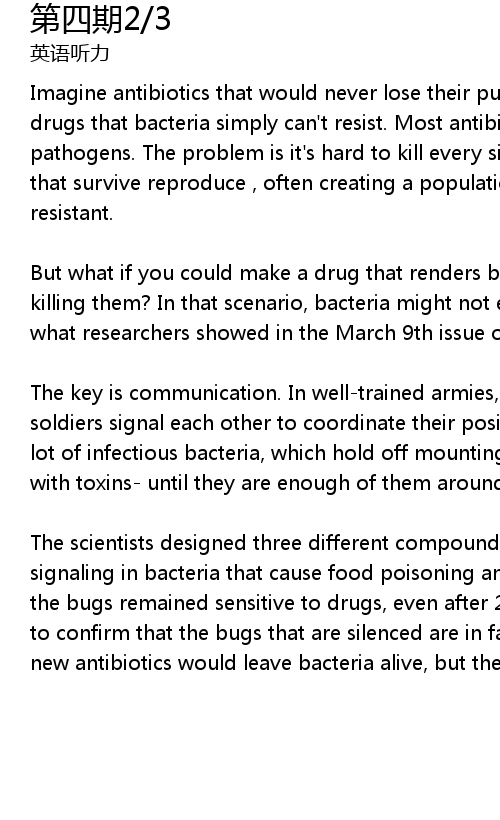 | Imagine antibiotics that would never lose their punch. New research focuses on drugs that bacteria simply can't resist. Most antibiotics work by killing pathogens. The problem is it's hard to kill every single microbe. The rare ones that survive reproduce , often creating a population that's antibiotic resistant. | |