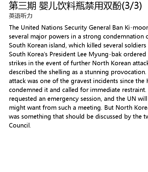 | The United Nations Security General Ban Ki-moon has joined South Korea and several major powers in a strong condemnation of North Korea's shelling of a South Korean island, which killed several soldiers and injured dozens of people. South Korea's President Lee Myung-bak ordered the army to retaliate with missile strikes in the event of further North Korean attacks. The US State Department described the shelling as a stunning provocation. Ban Ki-moon said the artillery attack was one of the gravest incidents since the Korean War ended in 1953. He condemned it and called for immediate restraint. No country has formally requested an emergency session, and the UN will wait to hear what South Korea might want from such a meeting. But North Korea's deputy ambassador said this was something that should be discussed by the two Koreas and not by the Security Council. |