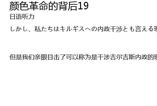 | 但是我们亲眼目击了可以称为是干涉吉尔吉斯内政的现场。获悉印刷厂的电源被切断,麦凯恩参议院下令接通吉尔吉斯外交部长的电话。参议员的来电,吉尔吉斯的外交部长接听。和外交部长的通话,向共和党国际研究所的各国支部实况转播。外交部长受到了一个多小时的严厉训斥,而且无法辩解,最后还被要求道歉。 |