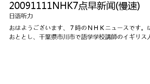 | おはようございます、7時のNHKニュースです。はじめに、この時間がお伝えする主なニュースです。 おととし、千葉県市川市で語学学校講師のイギリス人女性が殺害された事件で、死体遺棄の疑いで指名手配されていた市橋達也容疑者が昨夜、大阪で見つかり逮捕されました。警察は殺害にもかかわっていた疑いがあるとみて、遺体を自宅マンションのベランダに放置するまでの詳しい経緯について、本格的な取り調べを進めることにし… |