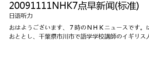 | おはようございます、7時のNHKニュースです。はじめに、この時間がお伝えする主なニュースです。 おととし、千葉県市川市で語学学校講師のイギリス人女性が殺害された事件で、死体遺棄の疑いで指名手配されていた市橋達也容疑者が昨夜、大阪で見つかり逮捕されました。警察は殺害にもかかわっていた疑いがあるとみて、遺体を自宅マンションのベランダに放置するまでの詳しい経緯について、本格的な取り調べを進めることにし… |