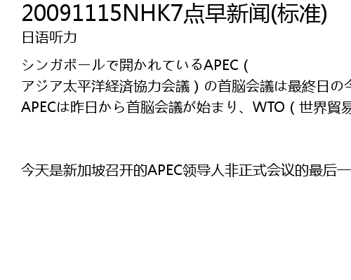| 今天是新加坡召开的APEC领导人非正式会议的最后一天,以金融危机后经济的可持续增长为主题展开了讨论,领导人宣言中纳入了明年日本担任APEC轮值主席国将会有的举措,如区域内长期经济增长战略等,预计该宣言将会被最终采纳。昨日以太平洋周边的21个国家以及地区参与的亚太经合组织领导人非正式会议开始,各国一致认为应加速协商、争取明年达成WTO贸易自由化谈判多哈议程的最终决议。因为把访问日本的日程提前了,所以迟到参加会议的… |
