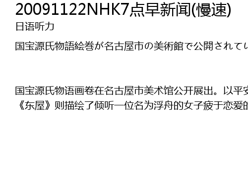 | guó bǎo yuán shì wù yǔ huà juàn zài míng gǔ wū shì měi shù guǎn gōng kāi zhǎn chū. yǐ píng ān shí dài gōng tíng wèi bèi jǐng de yuán shì wù yǔ huà juàn, zuò wéi zuì zǎo de wù yǔ huà juàn bèi zhǐ dìng wèi rì běn guó bǎo. huà juàn gòng cán liú xià le 19 juǎn 19 zhǒng chǎng jǐng, qí zhōng 15 juǎn shōu cáng zài míng gǔ wū shì de dé chuān měi shù guǎn, běn cì kāi fàng le qí zhōng de 2 juǎn. huà wù miáo xiě quán shì zhǔ rén gōng yóu guāng yuán shì huàn chéng xūn hé bi gōng hòu zhī hòu de hòu bàn bù. zhú hé miáo huì le zhǔ rén gōng xūn shào nián shí qī bài nián lái dào wū fū, bèi nǚ zǐ men xì nòng, yǐ jí fēng yǎ de xīn nián jǐng xiàng. dōng wū zé miáo huì le qīng tīng yī wèi míng wéi fú zhōu de nǚ zǐ pí yú liàn ài de gù shì bìng gěi yǔ ān wèi de |