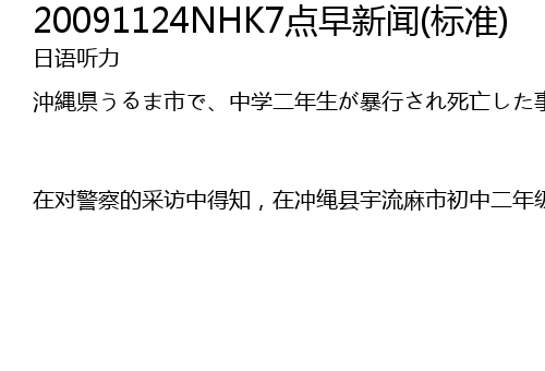 | 在对警察的采访中得知,在冲绳县宇流麻市初中二年级学生被施暴死亡事件中,被捕的少年们在救护车到达前,将死亡的学生所穿校服换成了其他学生的校服。警察正在就替换被害者校服的目的和详细经过进行深入调查。该事件发生在本月17日,目前警方怀疑是冲绳县宇流麻市八名初中二年级学生殴打同级生米盛星斗致死。其中,五人(14岁)被逮捕,三人(13岁)被进行辅导教育。在对警察的采访中得知了这一新的消息:该事件中被捕的少年们在救… |