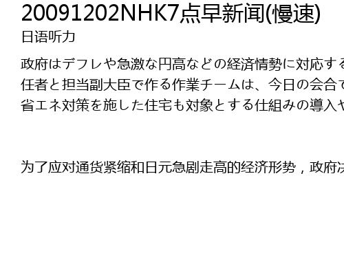 | 为了应对通货紧缩和日元急剧走高的经济形势,政府决定于本周确定第二次补充预算内所涉及的各项经济政策。在此之前,由执政党政策责任者及担当副大臣组成的预算构成委员会决定于今日先就草案达成一致意见。之前的预算构成委员的预算调整中,已包括扩大环保积分制度的适用范围,并将实行节能对策的住宅同时导入积分制度,放宽发放就业补助金的限制等等,以及对创造新就业岗位的企业和税收减少的地方财政给予经济援助等。在此之上,第… |