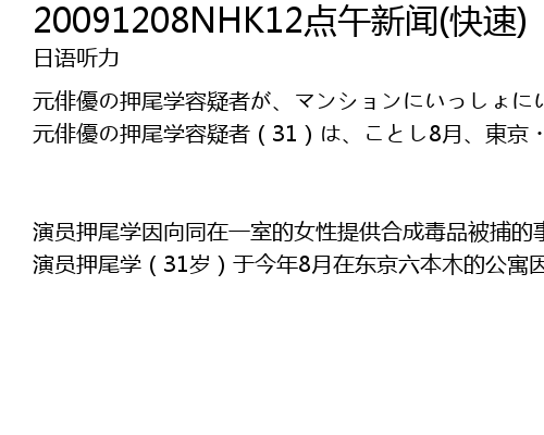 | 演员押尾学因向同在一室的女性提供合成毒品被捕的事件有了最新进展。据悉,警方已从嫌犯押尾的毛发中检验出合成毒品的成分,怀疑其有吸毒的习惯,正在展开进一步调查。 演员押尾学(31岁)于今年8月在东京六本木的公寓因吸食合成毒品MDMA(俗称“摇头丸”)被捕后,被判吸毒罪名成立,此后获得保释。日前,押尾学又因涉嫌向同在一室的一名30岁餐饮店女店员提供合成毒品导致其死亡,违反了兴奋剂管制法(又译:兴奋剂管制法),于昨日… |