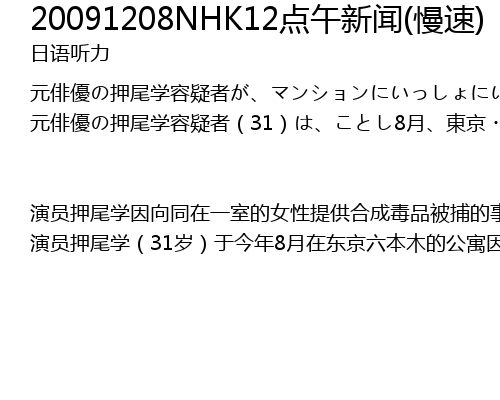 | 演员押尾学因向同在一室的女性提供合成毒品被捕的事件有了最新进展。据悉,警方已从嫌犯押尾的毛发中检验出合成毒品的成分,怀疑其有吸毒的习惯,正在展开进一步调查。 演员押尾学(31岁)于今年8月在东京六本木的公寓因吸食合成毒品MDMA(俗称“摇头丸”)被捕后,被判吸毒罪名成立,此后获得保释。日前,押尾学又因涉嫌向同在一室的一名30岁餐饮店女店员提供合成毒品导致其死亡,违反了兴奋剂管制法(又译:兴奋剂管制法),于昨日… |