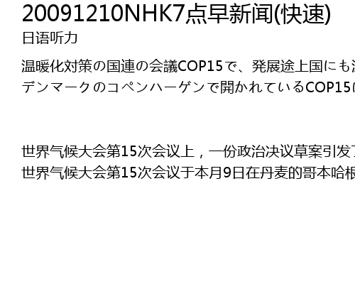 | 世界气候大会第15次会议上,一份政治决议草案引发了高度关注。草案中规定了发展中国家抑制温室气体增加的目标数值。对此,发展中国家阵营提出不同意见,认为发达国家应该制定更大幅度的削减目标,同时应加强对发展中国家的资金援助。双方分歧进一步加剧。 世界气候大会第15次会议于本月9日在丹麦的哥本哈根召开。目前,为制定新的议定书的基本框架以达到政治共识的商讨仍在持续,而一份由主办国丹麦拟定的政治决议草案引发了高度关… |