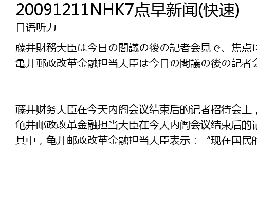 | 藤井财务大臣在今天内阁会议结束后的记者招待会上,就万众瞩目的来年度预算方案的组成以及国债的发行额一事,表明会坚守将其控制在44兆日元以下。 龟井邮政改革金融担当大臣在今天内阁会议结束后的记者招待会上,关于来年度预算案的编制工作一事表明:“打破财务省官吏性的思想是政治责任。应该实行以政治为主导的大规模的经济政策来谋求经济复苏。” 其中,龟井邮政改革金融担当大臣表示:“现在国民的生活状况已进入非常时期,加… |
