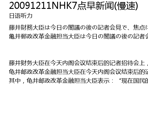 | 藤井财务大臣在今天内阁会议结束后的记者招待会上,就万众瞩目的来年度预算方案的组成以及国债的发行额一事,表明会坚守将其控制在44兆日元以下。 龟井邮政改革金融担当大臣在今天内阁会议结束后的记者招待会上,关于来年度预算案的编制工作一事表明:“打破财务省官吏性的思想是政治责任。应该实行以政治为主导的大规模的经济政策来谋求经济复苏。” 其中,龟井邮政改革金融担当大臣表示:“现在国民的生活状况已进入非常时期,加… |