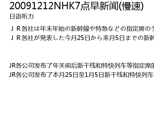 | JR各公司发布了年关前后新干线和特快列车等指定席的预约情况,交通拥挤的最高峰在下行线预计出现在本月30日,在上行线将出现在1月3日。受经济低迷和高速公路费下降等影响,本次预约人数达到JR成立以来最大降幅。 JR各公司发布了本月25日至1月5日新干线和特快列车指定席的预约情况,由于过年回乡省亲,本月30日将成为下行线的交通拥挤日。东海道山阳新干线开往博多、广岛的“希望号”和秋田新干线的“小町号”等,中午前的列车都将大… |