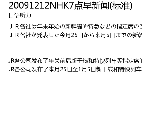 | JR各公司发布了年关前后新干线和特快列车等指定席的预约情况,交通拥挤的最高峰在下行线预计出现在本月30日,在上行线将出现在1月3日。受经济低迷和高速公路费下降等影响,本次预约人数达到JR成立以来最大降幅。 JR各公司发布了本月25日至1月5日新干线和特快列车指定席的预约情况,由于过年回乡省亲,本月30日将成为下行线的交通拥挤日。东海道山阳新干线开往博多、广岛的“希望号”和秋田新干线的“小町号”等,中午前的列车都将大… |