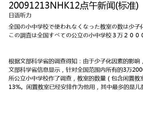 | 根据文部科学省的调查得知:由于少子化因素的影响,全国中小学闲置教室数量达到6万1000间,约占总数的13%。闲置教室被改用为幼儿园、老年人设施等。 文部科学省信息显示,针对全国范围内所有的3万2000 所公立小中学校作了调查,教室的数量(包含闲置教室在内)上升至约46万间。由于出生率低等原因,至今年五月为止,闲置房间增至6万1100间,约占全体 13%。闲置教室已经安排作为他用,其中最多的是儿童、学生(不同层次的)课外补习… |