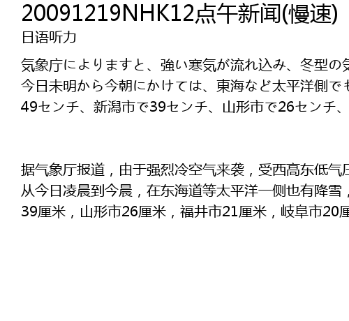 | 据气象厅报道,由于强烈冷空气来袭,受西高东低气压分布趋势加强的影响,以北陆地方为中心的日本海一侧将继续广泛降雪。 从今日凌晨到今晨,在东海道等太平洋一侧也有降雪,名古屋市、鹿儿岛市以及琦玉县熊谷市等地观测到了初雪。上午11点的积雪情况是富山市49厘米,新泻市 39厘米,山形市26厘米,福井市21厘米,岐阜市20厘米等。因强烈冷空气将会东移,太平洋一侧的降雪会逐渐停止,但在日本海一侧以北陆地方为中心的范围内直到明… |