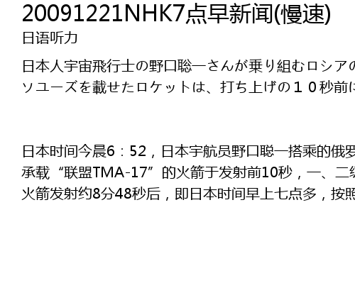 | 日本时间今晨6:52,日本宇航员野口聪一搭乘的俄罗斯“联盟TMA-17”在中亚·哈萨克斯坦境内的拜科努尔航天基地发射升空,约9分钟后进入预定轨道,成功地完成了本次发射。 承载“联盟TMA-17”的火箭于发射前10秒,一、二级火箭上的引擎同时点火,6:52分,随着轰隆巨响离开了发射台。运载火箭发出橙色光芒,持续上升,并陆续抛离一级火箭上已经燃烧完的四个助推器。 火箭发射约8分48秒后,即日本时间早上七点多,按照预定计划,火箭… |