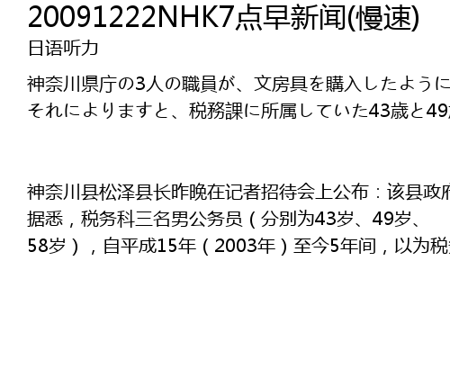 | 神奈川县松泽县长昨晚在记者招待会上公布:该县政府3名公务员以购买文具为名,自平成15年(2003年)至今5年间,预付给经销商1亿2000万日元。其中,以购书券的形式收取1500万日元回扣,用于私人消费。 据悉,税务科三名男公务员(分别为43岁、49岁、 58岁),自平成15年(2003年)至今5年间,以为税务科和县税务所等购买笔记本和圆珠笔为名,预付给县内四家经销商共计1亿2000万日元。之后,又从经销商那里收取回扣1500万日元购书券… |