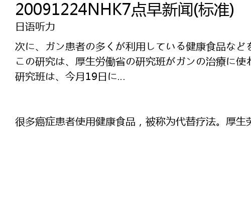 | 很多癌症患者使用健康食品,被称为代替疗法。厚生劳动省研究小组为对其有效性进行验证,召开集会,呼吁保健食品的业界团体和学会等提供相关信息,并开始收集作为验证对象的具体病例。在本次研究中,厚生劳动省的研究小组将通过临床试验等手段,对用于癌症治疗的各种代替疗法的有效性进行验证。研究小组于本月19日在大阪召开集会,决定收集确有治疗效果的具体病例以进行验证。并呼吁保健品业界团体和代替治疗法学会从本周开始提供相… |