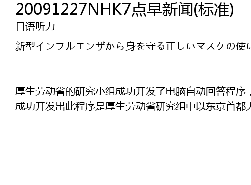 | 厚生劳动省的研究小组成功开发了电脑自动回答程序,此程序可以对预防甲型HIN1流感的口罩正确使用方法、狂犬病的治疗方法、感染症状的咨询等相关问题作出快速解答。 成功开发出此程序是厚生劳动省研究组中以东京首都大学菅又昌实教授为首的研究小组。该程序输入了基于围绕新型HIN1流感、狂犬病以及麻疹等12种感染症所最新研究出的病情情报和切身疑问的回答。自治体的负责人将其设想为接到普通的电话咨询的场景,对最新的治疗方法… |