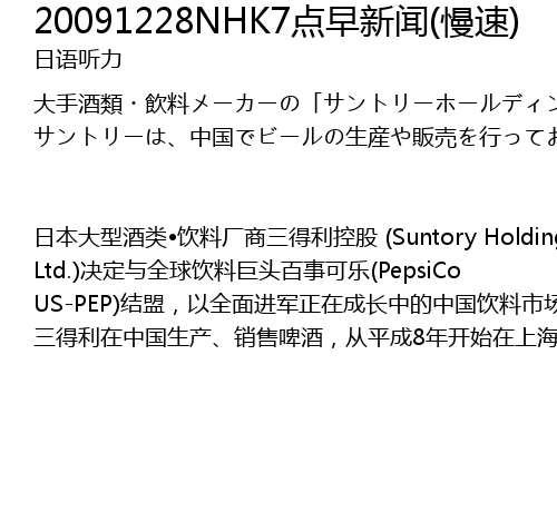 | 日本大型酒类•饮料厂商三得利控股 (Suntory Holdings Ltd.)决定与全球饮料巨头百事可乐(PepsiCo US-PEP)结盟,以全面进军正在成长中的中国饮料市场。 三得利在中国生产、销售啤酒,从平成8年开始在上海等地销售乌龙茶及橙汁等饮料。中国清凉饮料市场今后发展前景良好,然而三得利品牌独立销售急速扩大的难度较大,因此,三得利决定与在中国全境都拥有销售网络的世界大品牌饮料厂商——美国的百事可乐合作。具体而言,下月三得利将… |