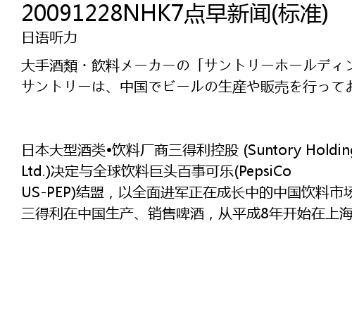 | rì běn dà xíng jiǔ lèi yǐn liào chǎng shāng sān dé lì kòng gǔ Suntory Holdings Ltd. jué dìng yǔ quán qiú yǐn liào jù tóu bǎi shì kě lè PepsiCo USPEP jié méng, yǐ quán miàn jìn jūn zhèng zài chéng zhǎng zhōng de zhōng guó yǐn liào shì chǎng. sān dé lì zài zhōng guó shēng chǎn xiāo shòu pí jiǔ, cóng píng chéng 8 nián kāi shǐ zài shàng hǎi děng dì xiāo shòu wū lóng chá jí chéng zhī děng yǐn liào. zhōng guó qīng liáng yǐn liào shì chǎng jīn hòu fā zhǎn qián jǐng liáng hǎo, rán ér sān dé lì pǐn pái dú lì xiāo shòu jí sù kuò dà de nán dù jiào dà, yīn cǐ, sān dé lì jué dìng yǔ zài zhōng guó quán jìng dōu yōng yǒu xiāo shòu wǎng luò de shì jiè dà pǐn pái yǐn liào chǎng shāng měi guó de bǎi shì kě lè hé zuò. jù tǐ ér yán, xià yuè sān dé lì jiāng |