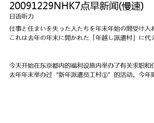 | 今天开始在东京都内的福利设施内举办了有关求职和住宿等相关问题的咨询会。该福利设施用于在年关前后为失业的流浪人提供住宿。 去年年末举办过“新年派遣员工村①”的活动。今年则改为在年关前后为东京失业的流浪人提供住宿。该福利设施于昨天正式开放。今天开始举办针对入住者求职、健康、住宿等相关问题的咨询会。咨询会在福利设施一楼的空房间举行。Hellowork②的职员、医生、保健师等组成的专家团队,与失业流浪人进行单独面谈… |