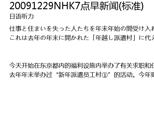 | 今天开始在东京都内的福利设施内举办了有关求职和住宿等相关问题的咨询会。该福利设施用于在年关前后为失业的流浪人提供住宿。 去年年末举办过“新年派遣员工村①”的活动。今年则改为在年关前后为东京失业的流浪人提供住宿。该福利设施于昨天正式开放。今天开始举办针对入住者求职、健康、住宿等相关问题的咨询会。咨询会在福利设施一楼的空房间举行。Hellowork②的职员、医生、保健师等组成的专家团队,与失业流浪人进行单独面谈… |