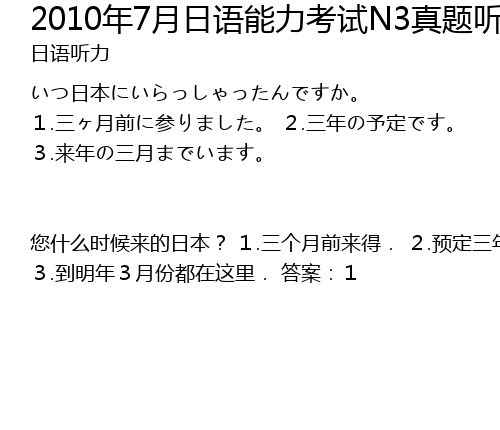 | 您什么时候来的日本? 1.三个月前来得. 2.预定三年。 3.到明年3月份都在这里. 答案:1 |