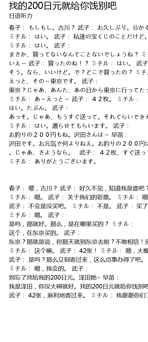 | chūn zi: wèi, gǔ chuān? wǔ zi: hǎo jǐu bu jiàn, zhī dào wǒ shì shuí ba? : . wǔ zi: guān yú wǒ men de cǎi piào. : . wǔ zi: bú huì shì méi mǎi ba. : bú shì. wǔ zi: mǎi le duì ba. : . wǔ zi: shì ma, nà jiù hǎo. nà me, shì zài nǎ lǐ mǎi de? : zhè gè, zài dōng jīng mǎi de. wǔ zi: dōng jīng? nà jiù shì shuō, nǐ nà tiān jiù dào dōng jīng qù la? bù gǎn xiāng xìn! fǎn zhèng yě bú huì zài jiàn dào nǐ le, wú suǒ wèi la. wǒ hé zé tián měi rén 5000 rì yuán gè mǎi le 16 zhāng, chū shān 3000 rì yuán mǎi le 10 zhāng, yī gòng 42 zhāng, méi shǎo ba? : zhè gè ma. wǔ zi: 42 zhāng! : , dà gài méi shǎo. wǔ zi: shì ma? nà me lì kè jì guò lái, zhè me diǎn shì bàn dé le ba. : , wǒ huì de. wǔ zi: bié wàng le zhǎo gěi wǒ de 200 rì yuán. zé tián tā zǎo miáo: wǒ shì zé tián, nǐ méi dà ài jiù hǎo. zhǎo de 200 rì yuán jiù gěi nǐ jiàn bié ba. yǒng bié la! wǔ zi: 42 zhāng, má lì dì jì guò lái. : wǒ xiè xiè nǐ men le. |
