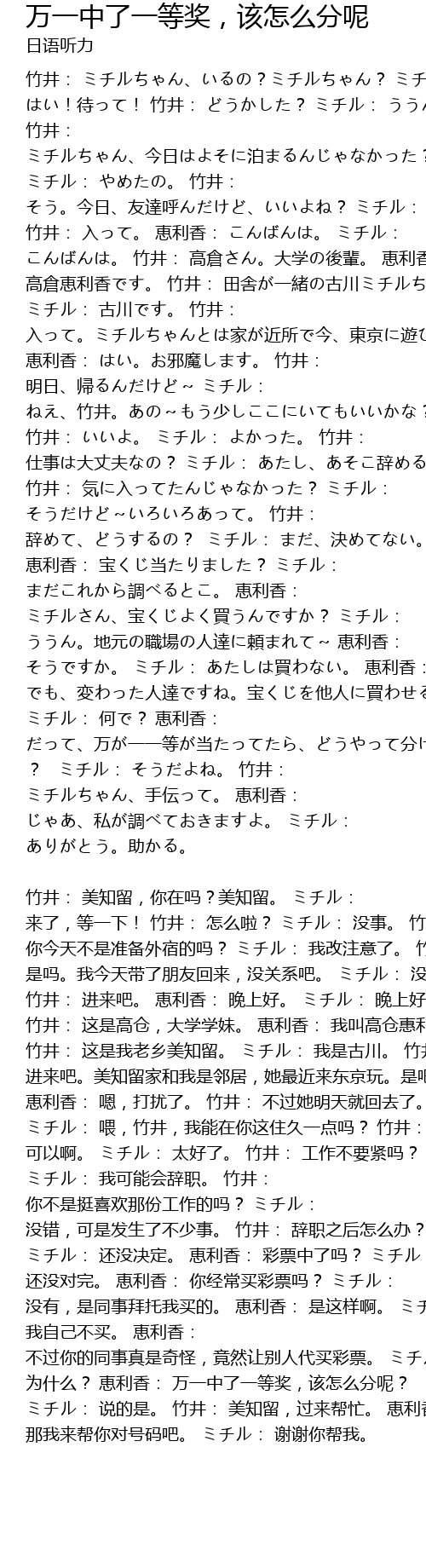 | 竹井: 美知留,你在吗?美知留。 ミチル: 来了,等一下! 竹井: 怎么啦? ミチル: 没事。 竹井: 你今天不是准备外宿的吗? ミチル: 我改注意了。 竹井: 是吗。我今天带了朋友回来,没关系吧。 ミチル: 没事。 竹井: 进来吧。 恵利香: 晚上好。 ミチル: 晚上好。 竹井: 这是高仓,大学学妹。 恵利香: 我叫高仓惠利香。 竹井: 这是我老乡美知留。 ミチル: 我是古川。 竹井: 进来吧。美知留家和我是邻居,她最近来东京玩。是吧?坐吧。 恵利香: 嗯,打扰了。 竹井: 不过她明天就回去了。 ミチル: 喂,竹井,我能在你这住久一点吗? 竹井: 可以啊。 ミチル: 太好了。 竹井: 工作不要紧吗? ミチル: 我可能会辞职。 竹井: 你不是挺喜欢那份工作的吗? ミチル: 没错,可是发生了不少事。 竹井: 辞职之后怎么办? ミチル: 还没决定。 恵利香: 彩票中了吗? ミチル: 还没对完。 恵利香: 你经常买彩票吗? ミチル: 没有,是同事拜托我买的。 恵利香: 是这样啊。 ミチル: 我自己不买。 恵利香: 不过你的同事真是奇怪,竟然让别人代买彩票。 ミチル: 为什么? 恵利香: 万一中了一等奖,该怎么分呢? ミチル: 说的是。 竹井: 美知留,过来帮忙。 恵利香: 那我来帮你对号码吧。 ミチル: 谢谢你帮我。 |