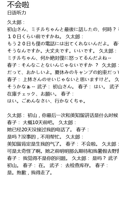 | jiǔ tài láng: chū shān, nǐ zuì hòu yī cì hé měi zhī liú jiǎng huà shì shén me shí hòu? chūn zi: dà gài 10 tiān qián ba. jiǔ tài láng: tā yǐ jīng 20 tiān méi jiē guò wǒ de diàn huà le. chūn zi: shì ma? méi shì de, bù yòng bāng máng. jiǔ tài láng: měi zhī liú kěn dìng shì shēng wǒ de qì le. chūn zi: bú huì la. jiǔ tài láng: kě shì tài qí guài le a. tā zhī qián míng míng nà me qī dài hé wǒ shǔ jià qù yě yíng de. chūn zi: wǒ jué de bú shì nǐ de wèn tí. jiǔ tài láng: shì ma? wǔ zi: chū shān. chūn zi: zài. wǔ zi: qù jiǎn chá kù cún. chūn zi: shì. bào qiàn, wǒ dé zǒu le. |