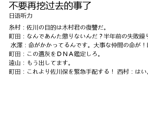 | 糸村:佐川の目的は木村君の復讐だ。 町田:なんであんた懲りないんだ?半年前の失敗繰り返すぞ。これ以上過去をほじくり返すのはやめろ! | |