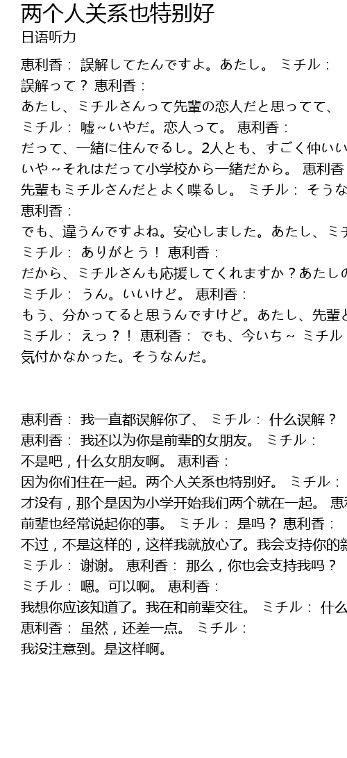 | huì lì xiāng: wǒ yī zhí dōu wù jiě nǐ le : shén me wù jiě? huì lì xiāng: wǒ hái yǐ wéi nǐ shì qián bèi de nǚ péng yǒu. : bú shì ba, shén me nǚ péng yǒu a. huì lì xiāng: yīn wèi nǐ men zhù zài yì qǐ. liǎng gè rén guān xì yě tè bié hǎo. : cái méi yǒu, nà gè shì yīn wèi xiǎo xué kāi shǐ wǒ men liǎng gè jiù zài yì qǐ. huì lì xiāng: qián bèi yě jīng cháng shuō qǐ nǐ de shì. : shì ma? huì lì xiāng: bù guò, bú shì zhè yàng de, zhè yàng wǒ jiù fàng xīn le. wǒ huì zhī chí nǐ de xīn shēng huó de. : xiè xiè. huì lì xiāng: nà me, nǐ yě huì zhī chí wǒ ma? : . kě yǐ a. huì lì xiāng: wǒ xiǎng nǐ yīng gāi zhī dào le. wǒ zài hé qián bèi jiāo wǎng. : shén me? huì lì xiāng: suī rán, hái chà yì diǎn. : wǒ méi zhù yì dào. shì zhè yàng a. |