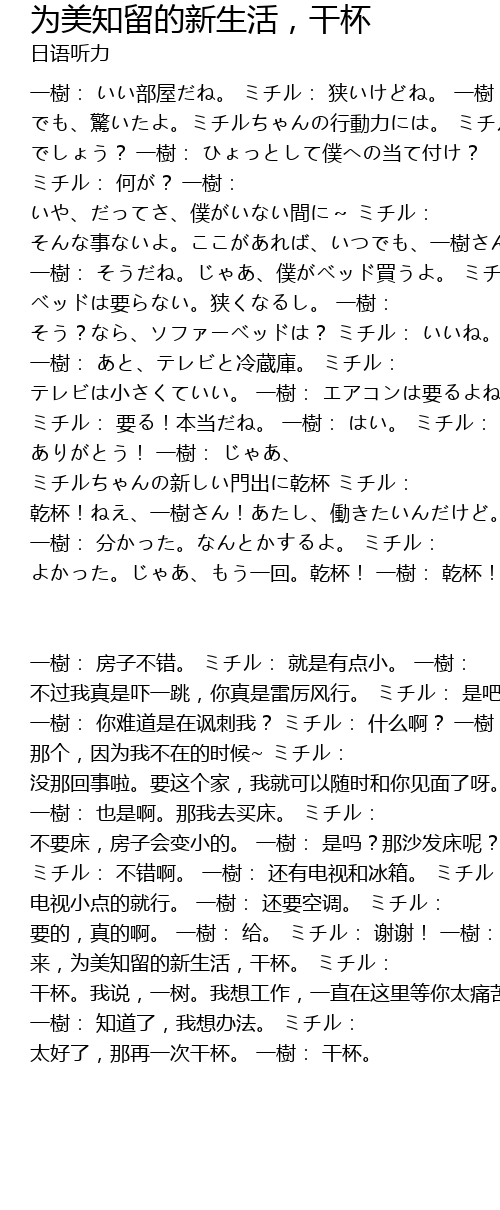| 一樹: 房子不错。 ミチル: 就是有点小。 一樹: 不过我真是吓一跳,你真是雷厉风行。 ミチル: 是吧。 一樹: 你难道是在讽刺我? ミチル: 什么啊? 一樹: 那个,因为我不在的时候~ ミチル: 没那回事啦。要这个家,我就可以随时和你见面了呀。 一樹: 也是啊。那我去买床。 ミチル: 不要床,房子会变小的。 一樹: 是吗?那沙发床呢? ミチル: 不错啊。 一樹: 还有电视和冰箱。 ミチル: 电视小点的就行。 一樹: 还要空调。 ミチル: 要的,真的啊。 一樹: 给。 ミチル: 谢谢! 一樹: 来,为美知留的新生活,干杯。 ミチル: 干杯。我说,一树。我想工作,一直在这里等你太痛苦了,能不能帮我找找书店的打工什么的啊? 一樹: 知道了,我想办法。 ミチル: 太好了,那再一次干杯。 一樹: 干杯。 |