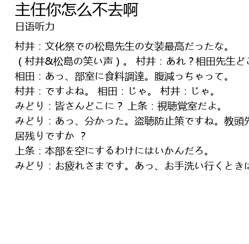 | 村井:文化祭での松島先生の女装最高だったな。 (村井&松島の笑い声)。 村井:あれ?相田先生どこに? 相田:あっ、部室に食料調達。腹減っちゃって。 村井:ですよね。 相田:じゃ。 村井:じゃ。 みどり:皆さんどこに? 上条:視聴覚室だよ。 みどり:あっ、分かった。盗聴防止策ですね。教頭先生は 居残りですか ? 上条:本部を空にするわけにはいかんだろ。 みどり:お疲れさまです。あっ、お手洗い行くときは留守番代わるので、声掛けてくださいね。応接室にいま~す。 |