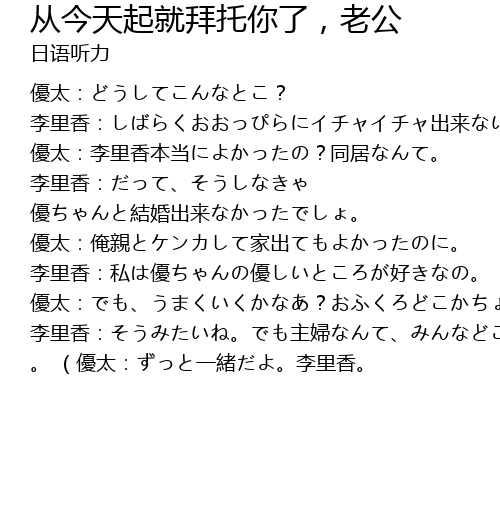 | yōu tài:? lǐ lǐ xiāng: chū lái. yōu tài: lǐ lǐ xiāng běn dāng? tóng jū. lǐ lǐ xiāng: yōu jié hūn chū lái. yōu tài: ǎn qīn jiā chū. lǐ lǐ xiāng: sī yōu yōu hǎo. yōu tài:?. lǐ lǐ xiāng:. zhǔ fù. dà zhàng fū. sī. yōu. jīn rì. dàn nà yàng . yōu tài: yī xù. lǐ lǐ xiāng. |